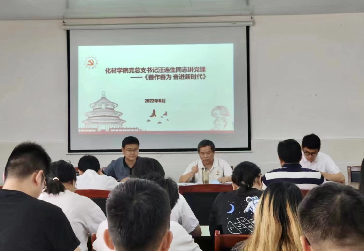 6月30日,化材学院党总支书记汪连生为全院党员师生讲授“善作善为 奋进新时代——学习贯彻湖北省第十二次党代会精神”专题党课。