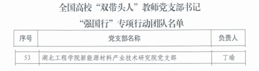 近日,教育部思想政治工作司公布了全国高校“双带头人”教师党支部书记“强国行”专项行动团队名单,我院william威廉中文新能源材料产业技术研究院党支部成功入选。此次入选,是我校基层党组织首次入选全国“强国行”团队,也是学校高质量党建引领事业高质量发展的重要成果,为学校基层党支部标准化规范化建设提供了样板和示范。