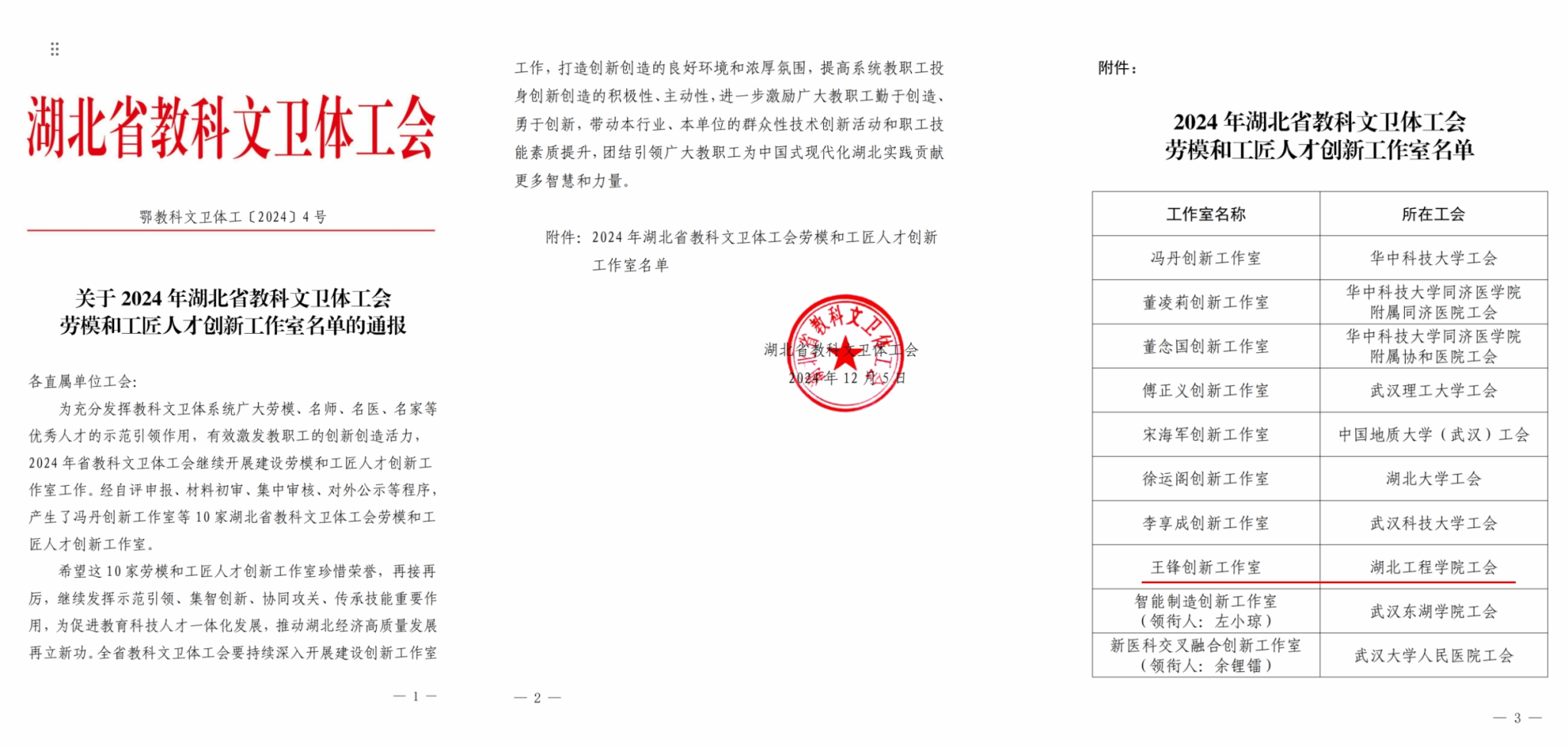 本网讯:近日,为充分发挥教科文卫体工会系统广大劳模、名师、名医、名家等优秀人才的示范引领作用,有效激发教职工的创新创造活力,省教科文卫体工会公布了2024年湖北省教科文卫体系统10家劳模和工匠人才创新工作室名单,william威廉中文王锋创新工作室入选。