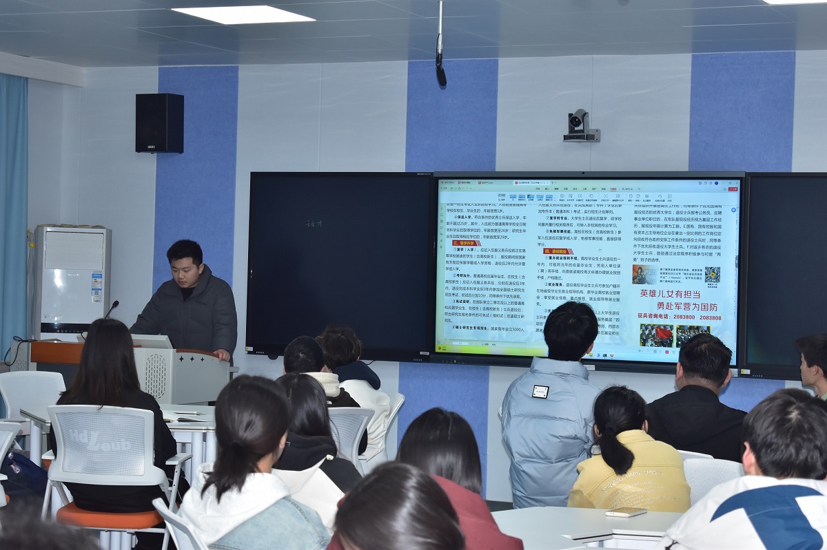 活动开始,辅导员周志程围绕2026年度征兵政策,从报名条件、入伍流程、学业保障、优待政策及发展路径等方面展开系统解读,结合化材学科特点,重点说明了部队对专业技术人才的需求与培养机制,鼓励同学们将专业所学融入国防事业。