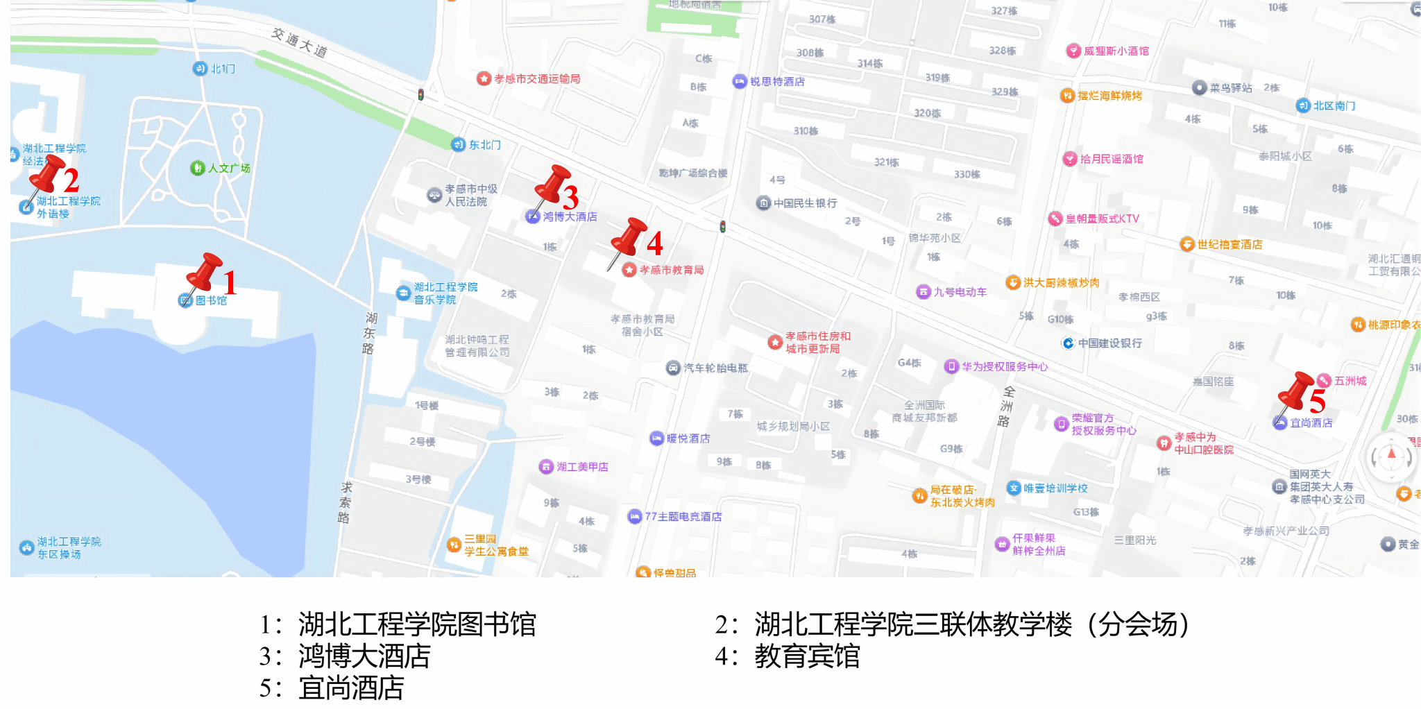 推荐住宿酒店:孝感鸿博大酒店、教育宾馆(位于鸿博大酒店东边)、宜尚酒店,参会期间的用餐在鸿博大酒店进行。相关位置区域图见下图:
