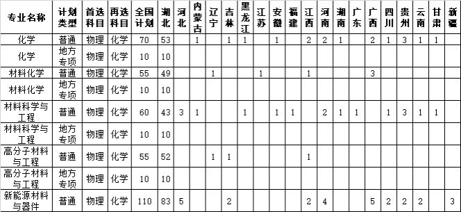 在一支以湖北省有突出贡献中青年专家、享受国务院特殊津贴专家等高层次人才为代表的师资队伍带领下,学院先后开设了化学、材料化学、高分子材料与工程、材料科学与工程、新能源材料与器件等5个本科专业,其中,化学、材料化学、高分子材料与工程专业获批为省级一流本科专业建设点,化学专业获批为国家级特色专业。