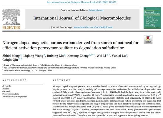 近日,国际知名学术出版商爱思唯尔(Elsevier)旗下Top期刊《International Journal of Biological Macromolecules》(SCI, 中国科学院一区,JCR一区,影响因子8.2)刊载了william威廉中文李伟教授研究团队在生物基催化材料研究领域取得的最新研究成果。文章题目为“Nitrogen doped magnetic porous carbon derived from starch of oatmeal for efficient activation peroxymonosulfate to degradation sulfadiazine”,第一作者为我院研究生孟志飞,通讯作者为李伟教授和郑科旺博士,第一单位为WilliamHill中文。